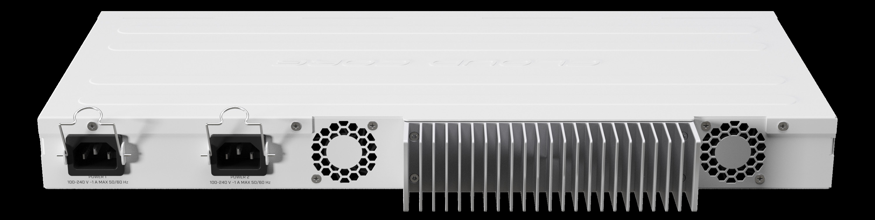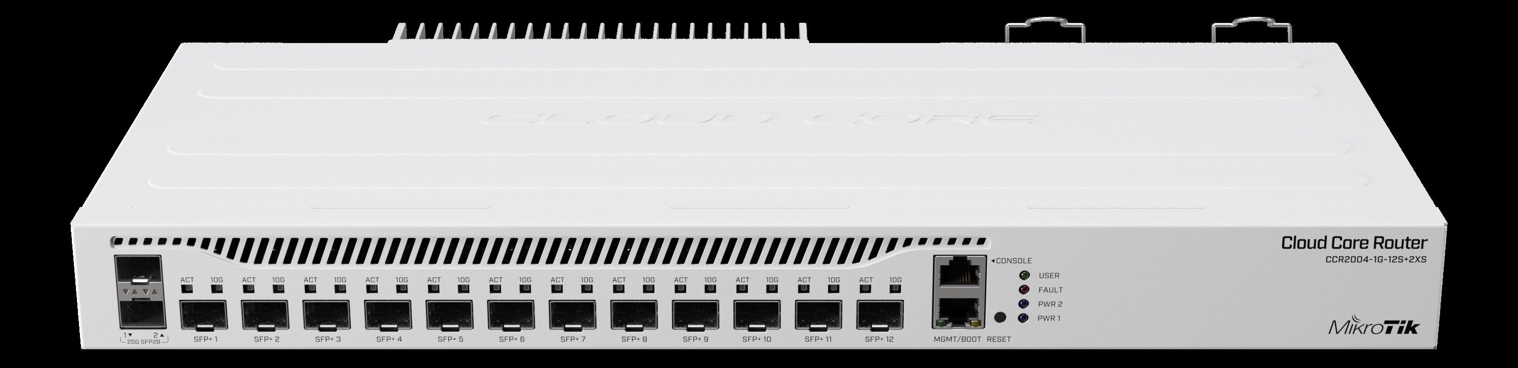 Cloud Core Router 2004-1G-12S+2XS with Annapurna Alpine AL32400 Cortex A57 CPU (4-cores, 1.7GHz per core), 4GB RAM, 1x Gigabit RJ45 port, 12x 10G SFP+ cages, 2 x 25G SFP28 cages, RouterOS L6, 1U rackmount case, Dual PSU