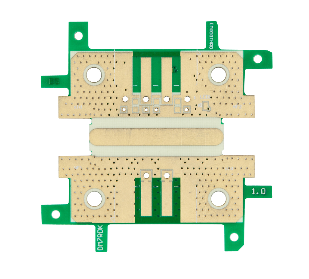 Platinenmaterial RO4350, 1.55mm stark. Die Bahnen sind nach Microstrip für 50 Ohm ausgelegt. Überbrückungen durch SMD 0805 0R Widerstände.