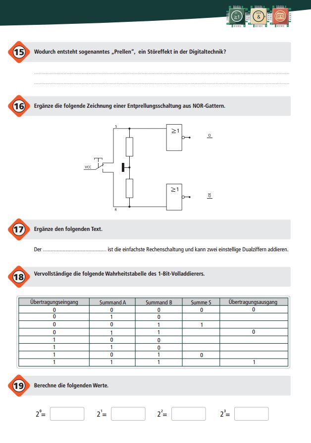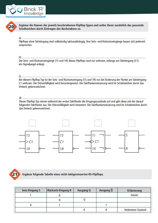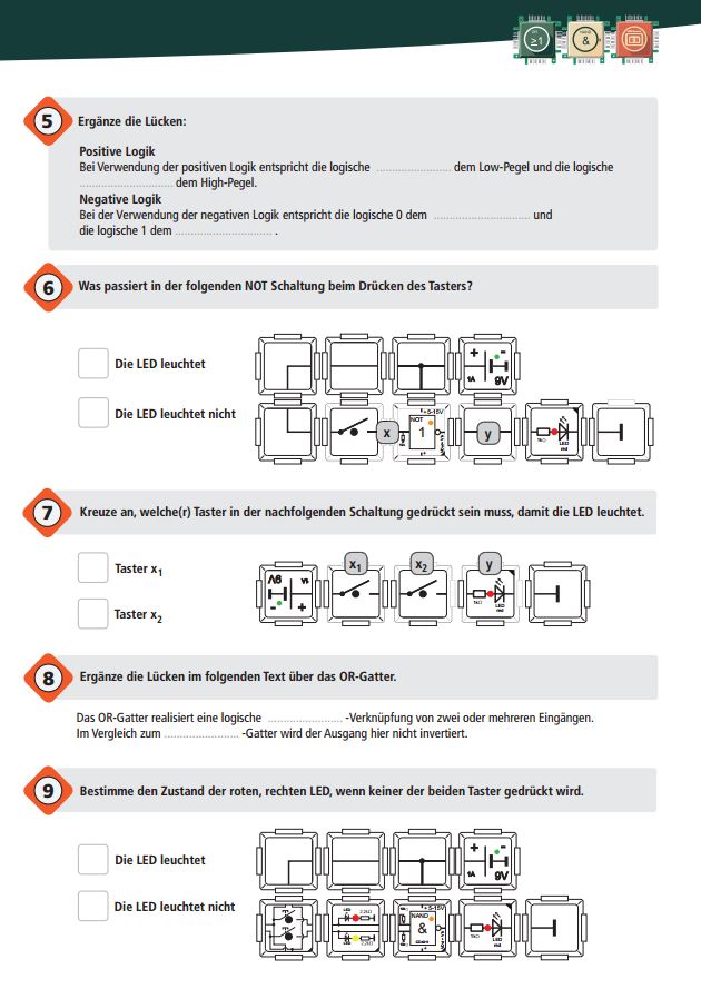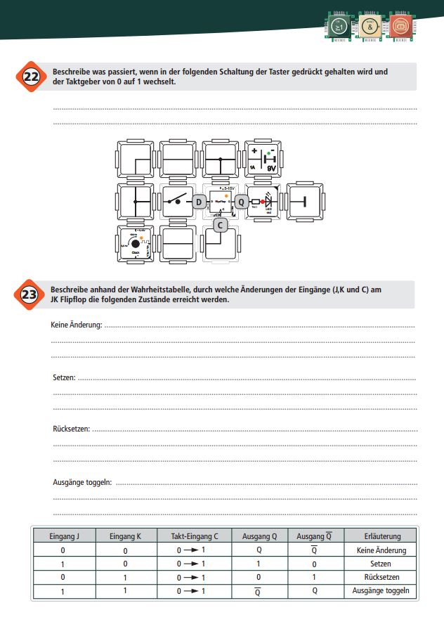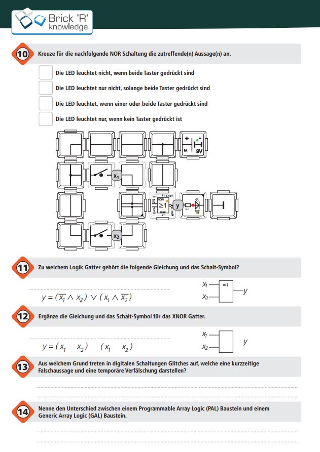 Dies ist ein Übungsheft mit Aufgaben und Widerholungen für Schüler und Lernende, welches auf den Informationen des Logic Set Handbuchs basiert. Mit diesem Heft können die gelernten Gatter, Schaltungen, Zahlsysteme und elektronischen Gesetze anschaulich und spielerisch abgefragt werden. Dieser Artikel enthält 10 gedruckte Übungshefte, die in einer Brick Tasche versendet werden. Das Übungsheft kann auch kostenlos als PDF auf der Website www.brickrknowledge.de heruntergeladen werden.