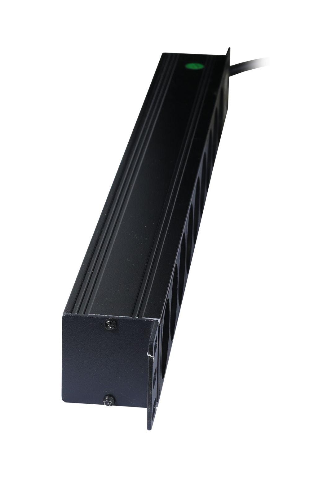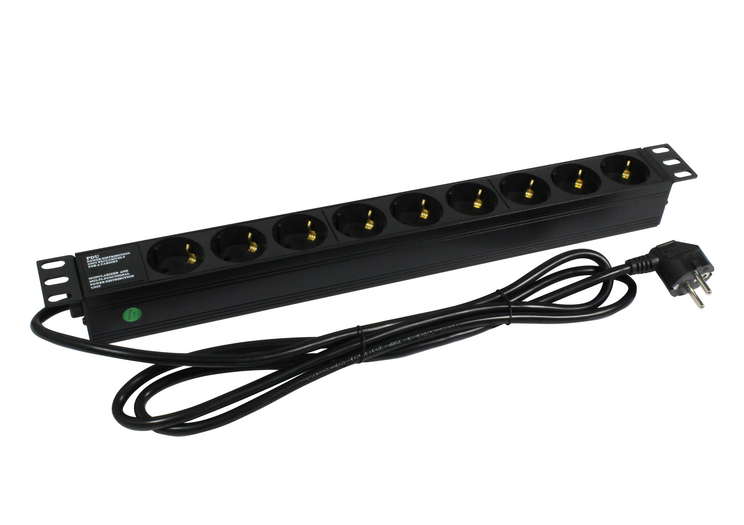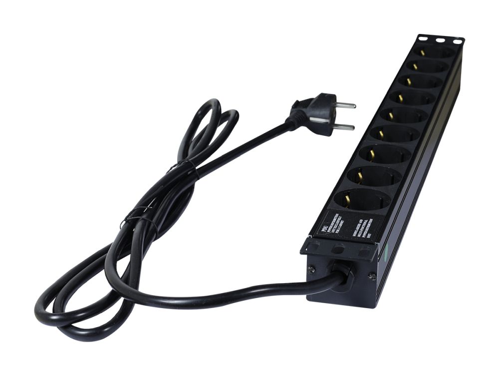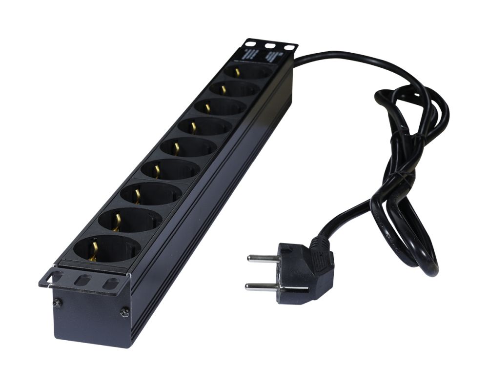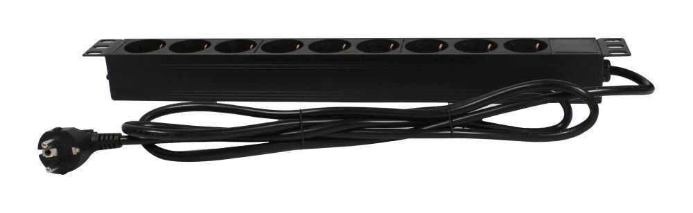 Gehäuse Aluminium Schwarz, 19"/1HE, L=440mm, Zuleitung 2m(3x1,5mm²) mit Schutzkontaktstecker, 9xSchutzkontakt(Dosen,CEE7) -> Schutzkontakt(Stecker,CEE7), TUL-GER(16)N1009W-B19AX, 19" Winkel(nicht umbaubar),