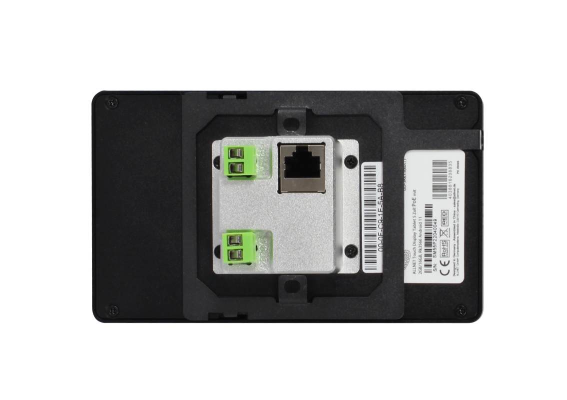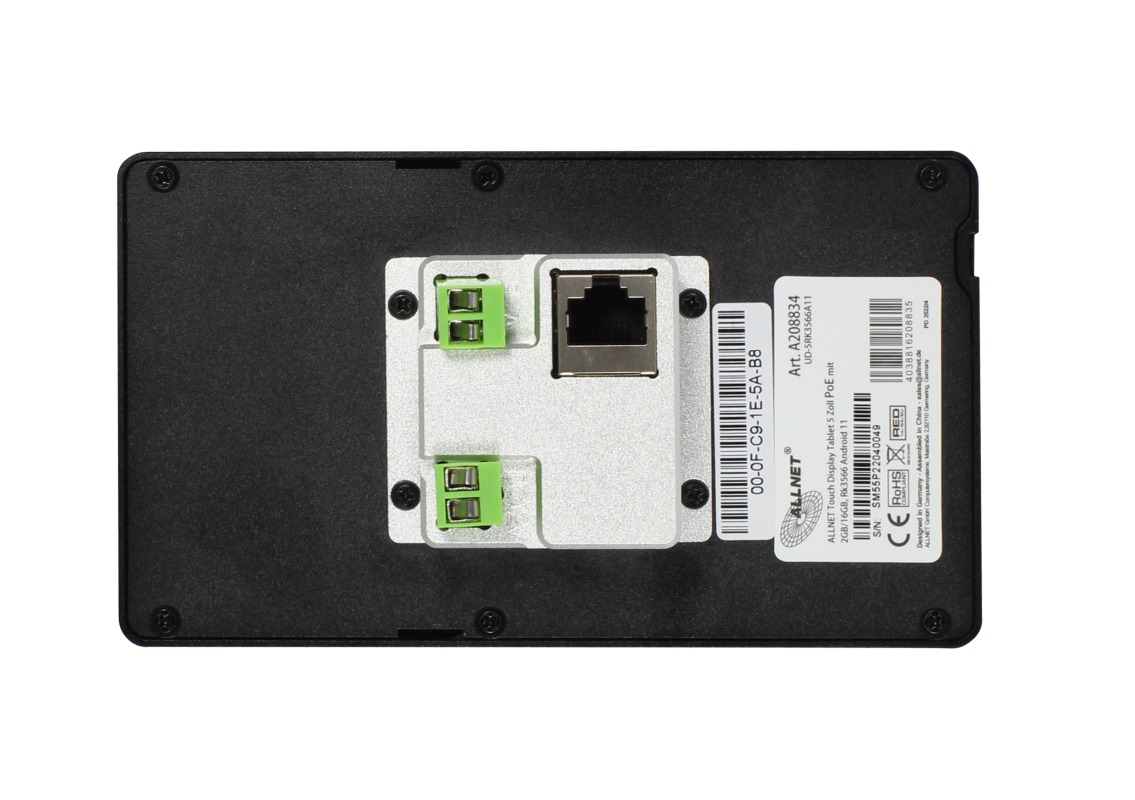 Einbau-Touch-Display mit Rockchip RK3566 CPU und Android. 2GB Ram / 16GB Speicher. Erweiterbar über USB und SD-Karten. Auflösung 720x1280, PoE (Power over Ethernet). Stromversorgung 12-24V möglich.