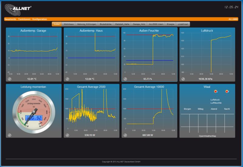 Sie steuern alles von einem PC, Notebook oder anderem Mobile Device, wie Smartphone oder Webpad. Egal ob die Geräte, die Sie steuern, messen, regeln möchten, im selben Gebäude oder auf einem anderen Kontinent stehen. Der ALLNET ALL5000v2 ist über eine IP Adresse erreichbar. Als Medium dienen Ihr vorhandenes Computernetzwerk und das Internet. Die ermittelten Werte können über den Webbrowser direkt vom Gerät abgerufen oder per Email periodisch verschickt werden bzw. wenn eine Über- oder Unterschreitung bestimmter voreingestellter Grenzwerte erfolgt. Eine integrierte JSON-Schnittstelle dient zur Datenabfrage von extern über das Internet.