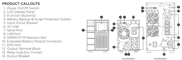 On-Line Doppelwandler, (1) USB, (1) seriell, (1) Relay, (1) EPO, (2) IEC C13, (2) CEE7