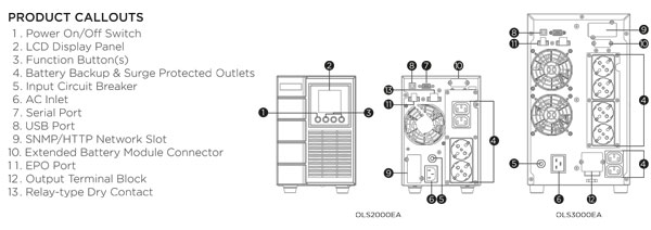 On-Line Doppelwandler, (1) USB, (1) seriell, (1) Relay, (1) EPO, (2) IEC C13, (4) Schutzkontakt Steckdosen