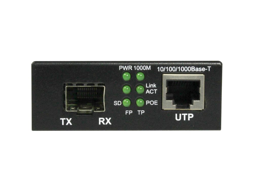 - 1x 10/100/1000BaseT Ethernet TP Port mit IEEE802.3at max. 30W PoE; 1x 1000BaseSX/LX SFP Slot
