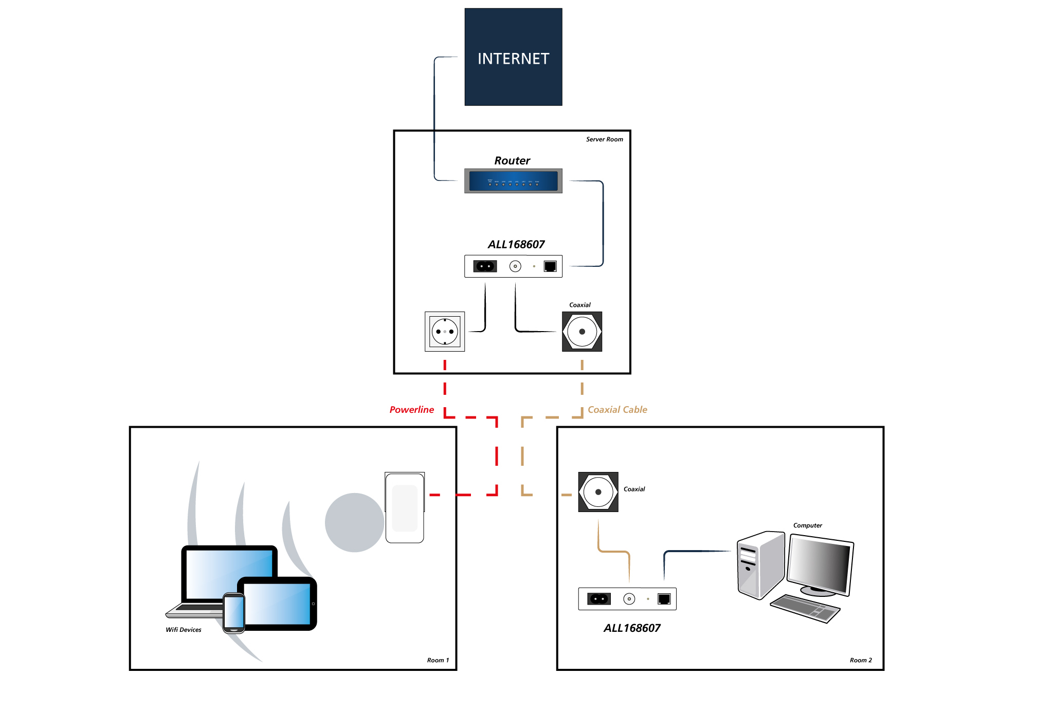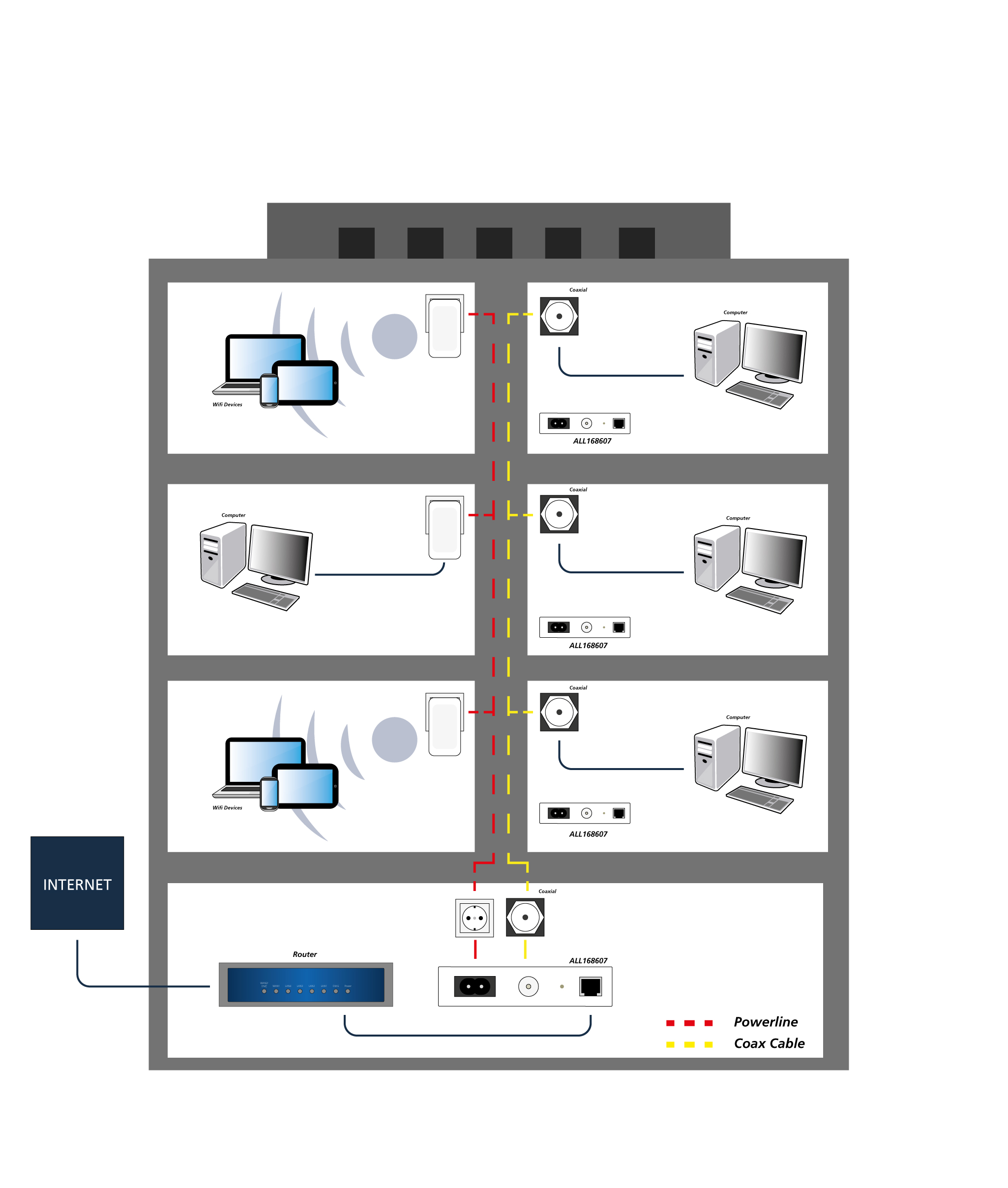 Der ALL168207 ist das richtige Gerät, wenn man über eine Coax-Verkabelung (z.B. TV-Antennenkabel) Netzwerkanschlüsse zur Verfügung stellen will. Bis zu 200 Mbit/s Übertragungsrate brutto können dabei erreicht werden und es sind Kabellängen bis zu ca. 800m möglich. Die Reichweite hängt von den installierten Dosen, Dämpfungsgliedern, Filtern etc. des Kabelnetzes ab.