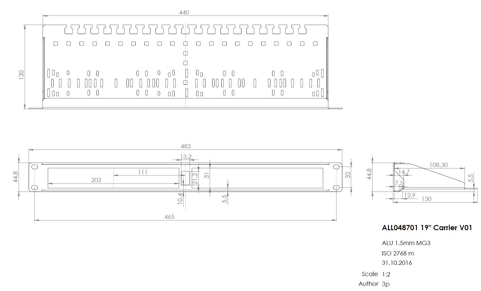 1HE 19" Universal Einbauboden zum Festzurren von Kleingeräten, 2 Slots für Endgeräte z.B. für ALL048605PD / ALL048700 / ALL048600 Einbaugröße Ausschnitt = 202 mm x 31mm