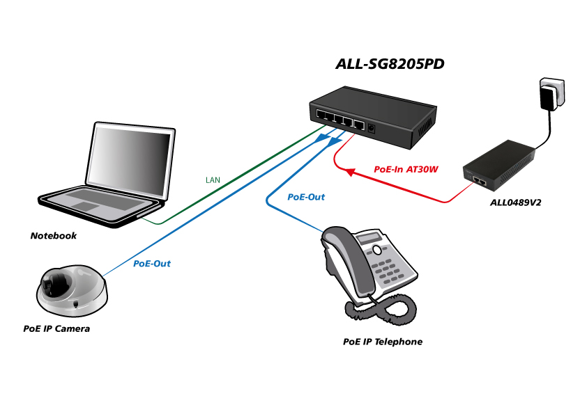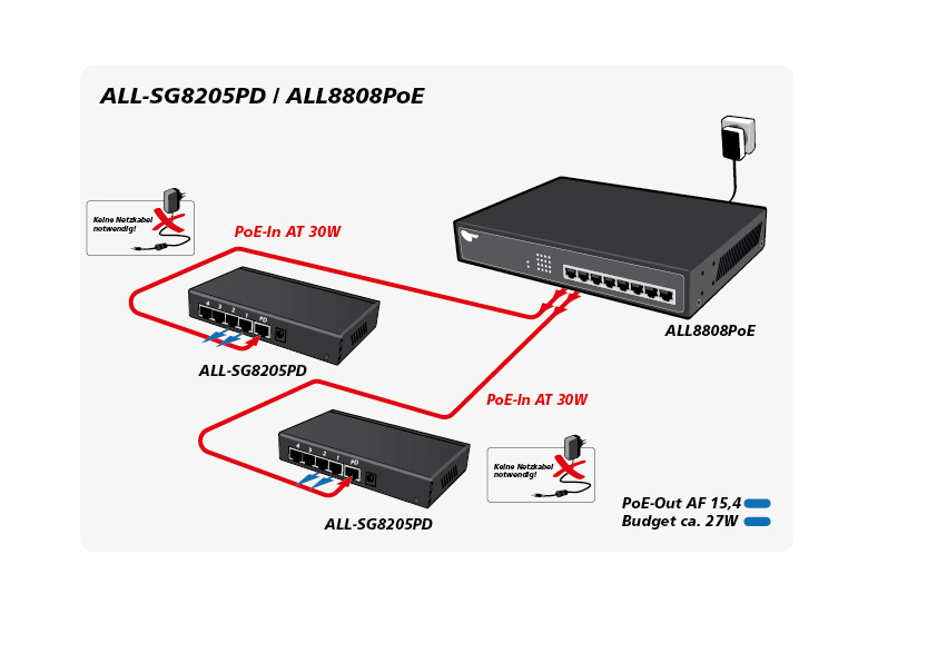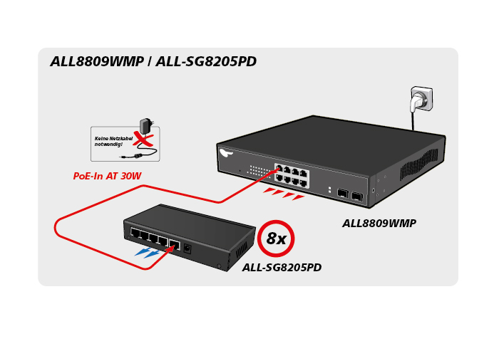 Der ALL-SG8205PD ist ein PoE Switch aus dem Hause ALLNET der sowohl seinen eigenen Betriebsstrom über Power over Ethernet bezieht, als auch in der Lage ist, bis zu zwei PoE fähige Endgeräte über das Netzwerkkabel mit Daten und Strom zu versorgen! Die Leitungslänge kann bis zu 100 Meter zum ALL-SG8205PD und weitere 100 Meter vom ALL-SG8205PD zum Endgerät betragen. Dies sorgt für eine nie gekannte Freiheit und Fexibilität bei der Installation. Speziell für die Anbindung von IP-Kameras und WLAN Access Points ist der ALL-SG8205PD die ideale Lösung.