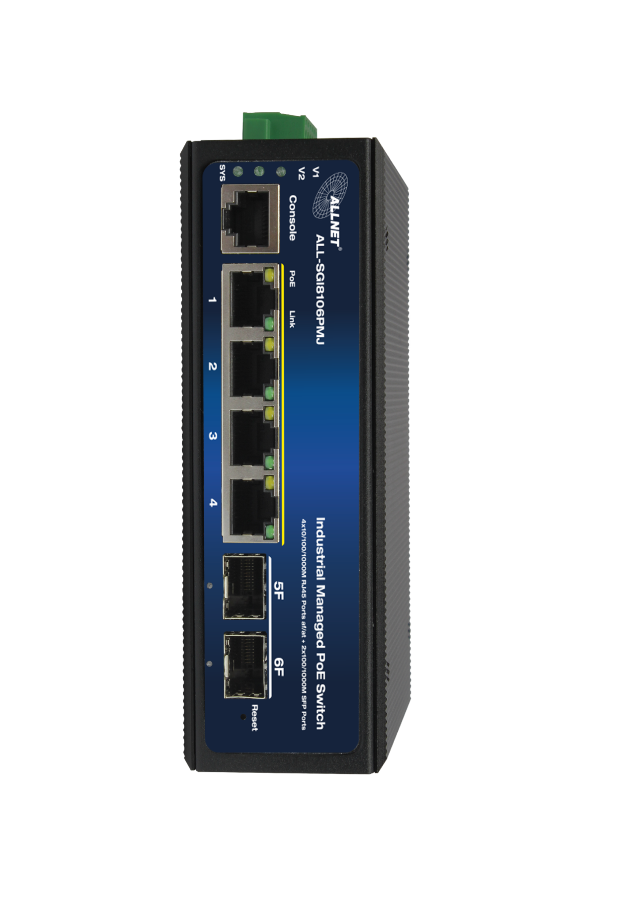 ALLNET Switch industrial full managed Layer2+ 6 Port GbE PoE Budget 360W 4x PoE bt 2x SFP Lüfterlos DIN ALL-SGI8106PMJ-BT