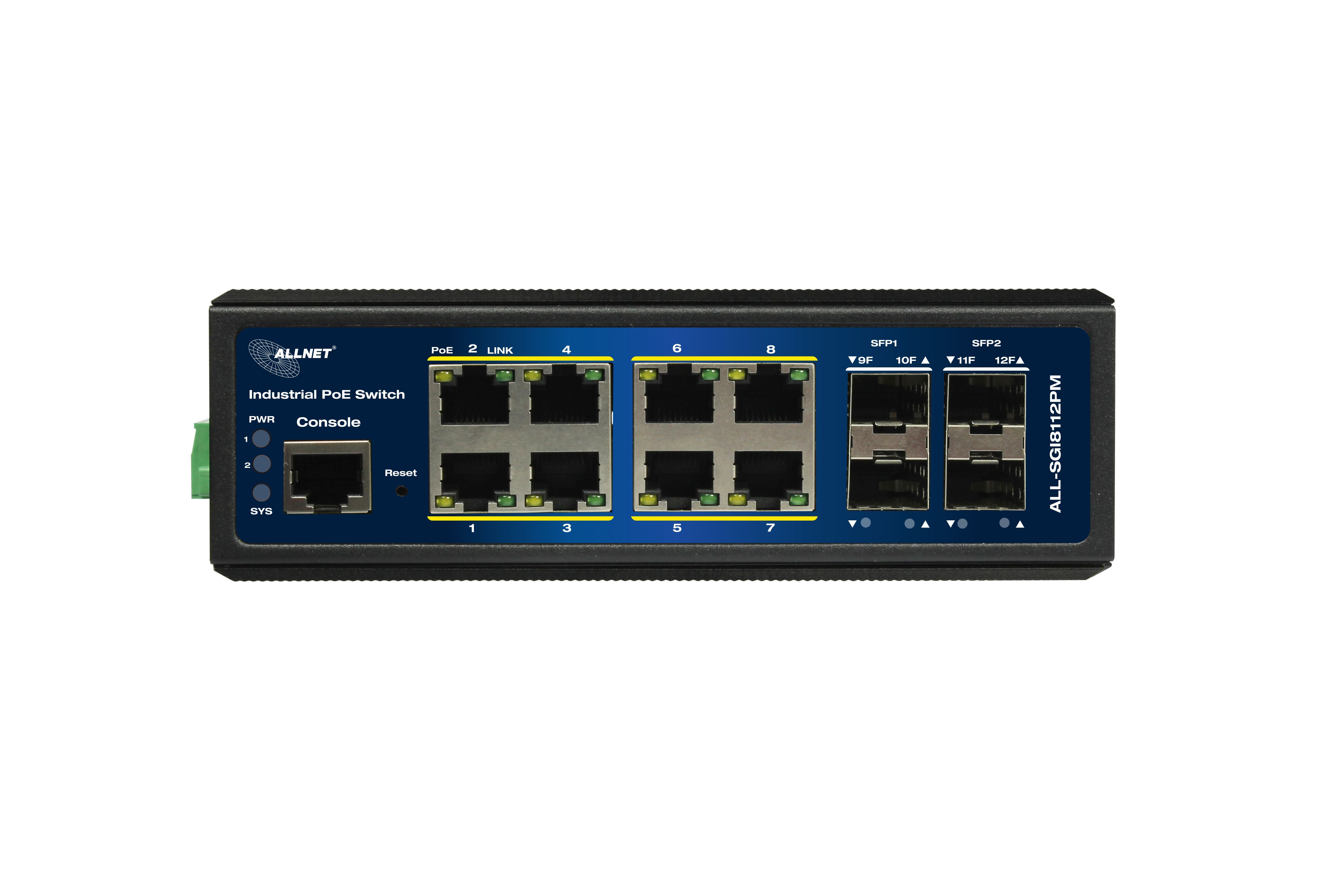 ALLNET Switch industrial full managed Layer2+ 12 Port GbE • PoE Budget 240W • 8x PoE at • 4x SFP • Lüfterlos • DIN • JSON API • ALL-SGI8112PMJ