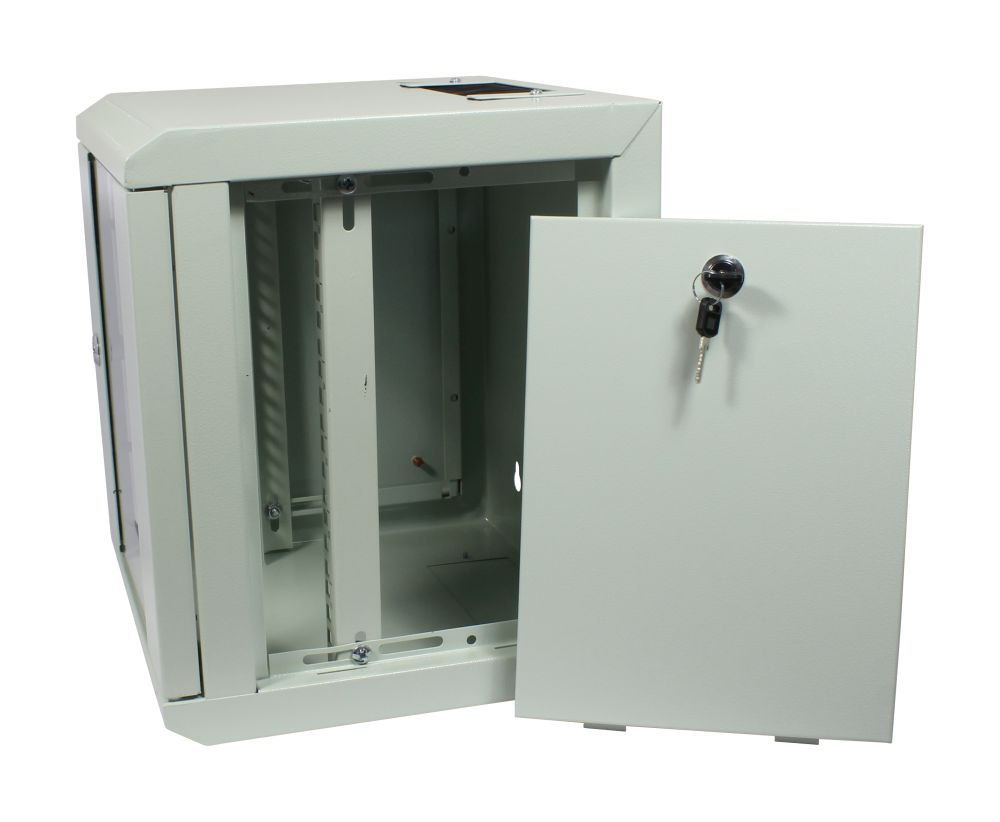 1-teilig Vormontiert, H218xB312xT300mm, Lichtgrau ähnlich RAL7035, Glastüre mit Schloss, 2x Seitenteil mit Schloss, 2xLochrasterprofile 19"(vorderseite), 2x Öffnungen für Kabeleingang unten/oben (B145/T64mm), 1x Bürstenleiste für Kabeleingang oben, Stahlblechgehäuse, 19" Profile vorne veränderbar (max. Veränderbare auf Nutztiefe 220mm), Patchtiefe vorne 60mm, 12xKäfigmutter mit Schrauben,