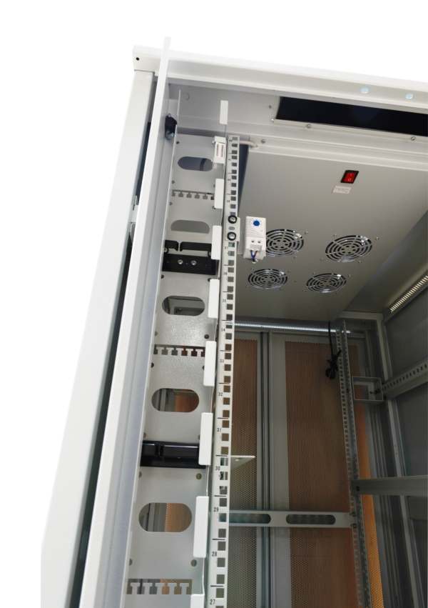 Schrank vormontiert, H2000/B800/T1210mm, Nutztiefe 1050mm, Lichtgrau ähnlich RAL7035, 4xLochrasterprofile 19" (Vorder/Rückseite) mit Einteilung der Höheneinheiten, 1xperforierte Blechfronttüre 1-teilig mit Schloss, 1xperforierte Blechrücktüre 2-teilig mit Schloss, 2xSeitenteile abnehmbar mit Schloss, verstellbare Füße(H20-70mm), 1xpaar L-Winkel T950/B40/H40mm (Nutzbreite 450mm), 1xZwischenboden T950/B470/H45mm (Nutzbreite 450mm), 1xKabelführungsplatte mit Abdeckung, 4xLüfter mit Thermostat, 20xKäfigmutter mit Schrauben, 2x senkrechte Kabelführungskanal (rechts/links vorne) aufklappbar, Schrank komplett zerlegbar, 19"Profilabstand(vorne/hinten) 1000mm(veränderbar bis 1080mm, in Schritten von 20mm), Erdungsbolzen M6(Türen mit Erdungskabel), Kabeleingang mit Bürstenleiste oben(vorne/hinten) und unten(vorne,mittig,hinten), Türen umbaubar(links/rechts), Patchraum vorne 75mm, ohne Sockel, incl. Rollenset(2x mit/2x ohne Feststeller)