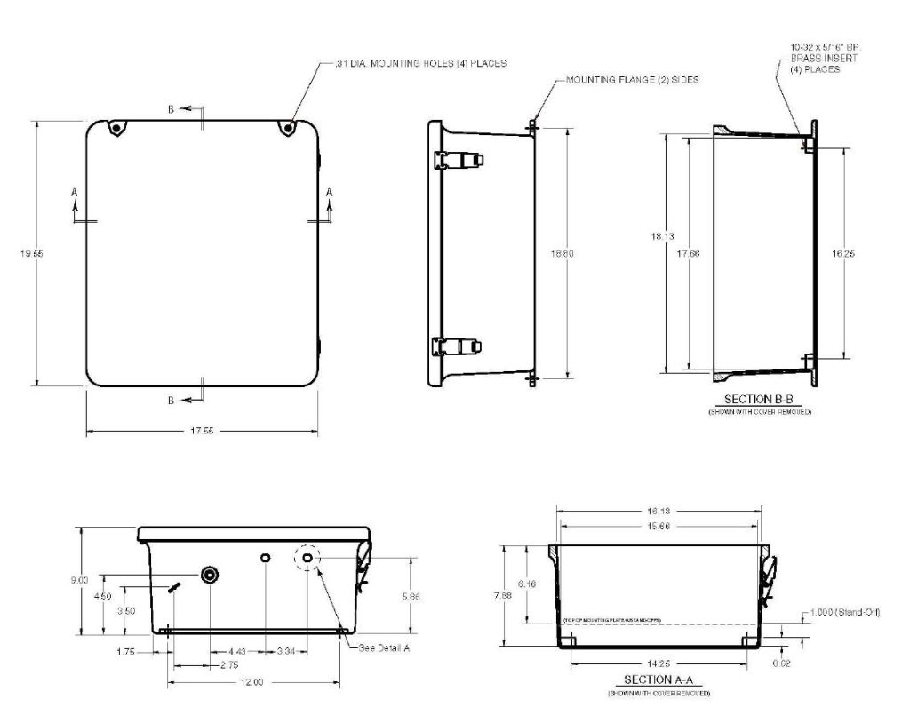 The box is a rugged 18" x 16" x 8" weatherproof enclosure that is ideal for both indoor and outdoor applications. Constructed from molded fiberglass, it is well suited for high temperature or corrosive environments. The mounting flange allows it to be wall mounted as well as on a flat surface. The box can also be pole mounted with the optional pole mounting hardware kit. The fully gasketed lid features a stainless steel continuous hinge and stainless steel quick release latches with padlock hasps. The enclosure material is UV stabilized and comes in machine tool gray.