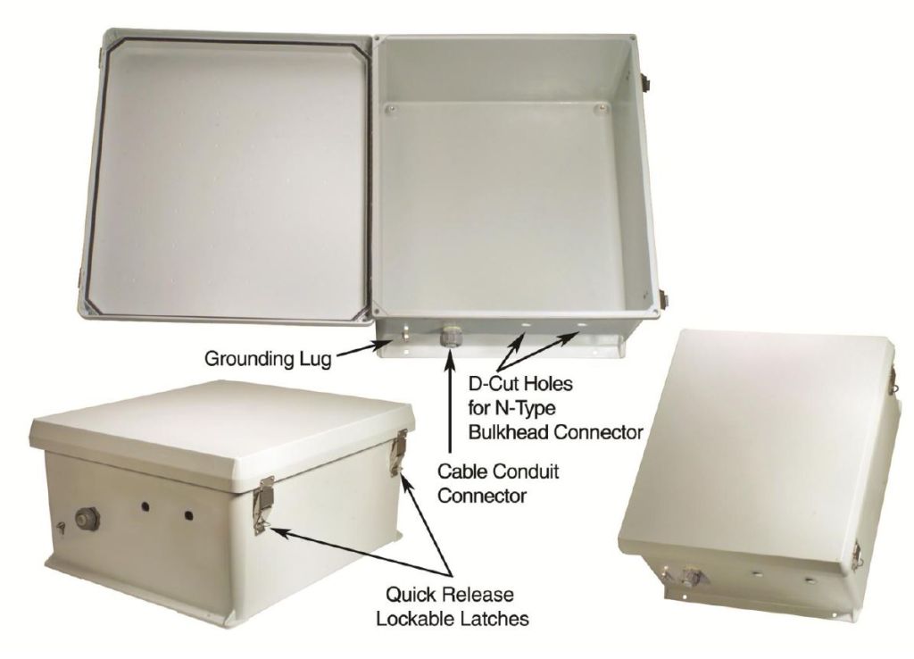 L-com's HyperLink brand non-powered NEMA rated enclosures are perfect for housing both wired and wireless communications equipment. These robust, weatherproof enclosures feature sealed, gasketed raised lids and quick release lockable latches. This Enclosure is 18" x 16" x 8" and has entry holes for Coax and Power Cable pre-drilled. The Enclosure comes without a Mounting Plate.